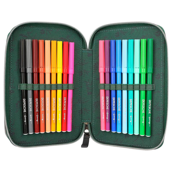 Het dinosterke groene etui van Dino World heeft een tof organische print en een megacoole patch van een T-Rex die aan de ketting ligt. De drie aparte vakken zijn compleet gevuld met 18 kleurpotloden, 18 viltstiften, 2 potloden, een gum, puntenslijper, liniaal, schaar, plakstift en een klein vakje met klittenband. Handig: aan de achterkant van het etui vind je drie vakken om pennen in te schuiven. Dan heb je die altijd snel bij de hand!