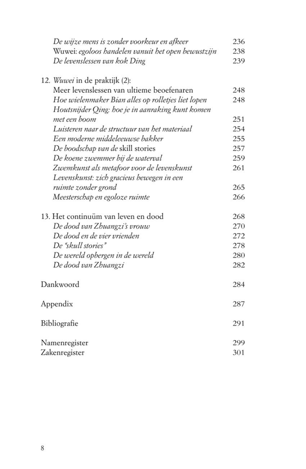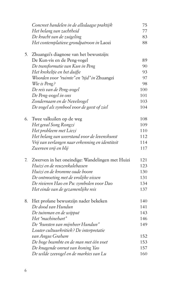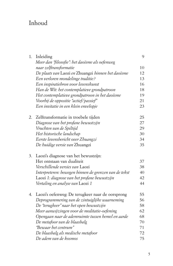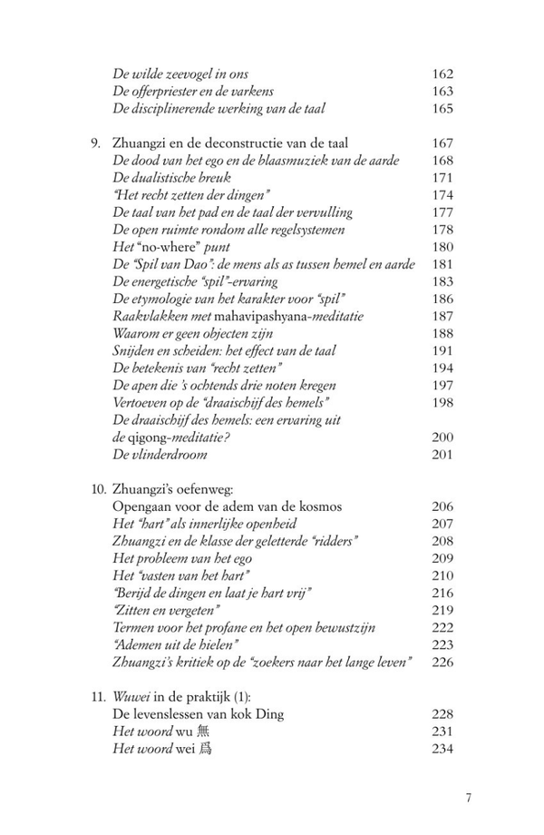 Hoewel Zhuangzi in het Nederlandstalige gebied steeds bekender wordt, is er nog niet veel aandacht besteed aan zijn spirituele oefenweg. Daarin speelt de deconstructie van de taal een belangrijke rol, naast een vorm van meditatie die gericht is op het deconditioneren en verruimen van het alledaagse bewustzijn. Door deze praktische aspecten helder voor het voetlicht te brengen, in de filosofische context van Daodejing en Zhuangzi, laat dit boek zien dat Zhuangzi’s daoïstische oefenweg ook in de moderne tijd nog steeds een grote inspiratiebron kan zijn voor het dagelijks leven.