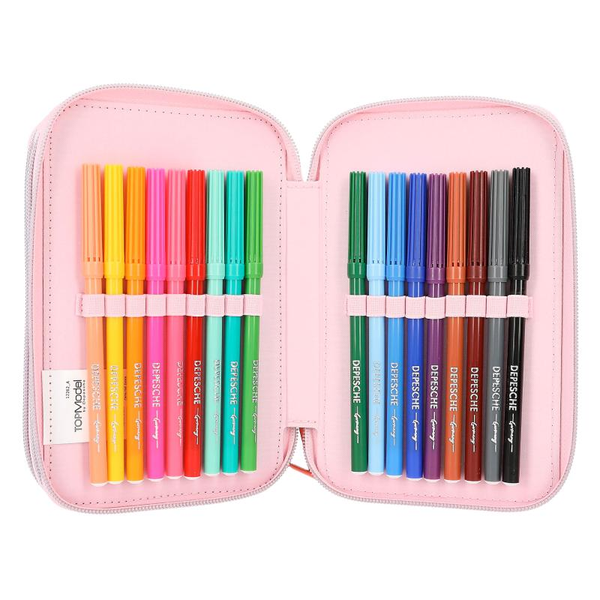 Een etui om mee te ontwerpen: met de aan de rits hangende roze schrijvende stift kun je het T-shirt van het TOPModel elke keer weer een andere look geven en het er daarna weer afvegen. Nog vrolijker word je van de grappige smiley's en de kleur roze. De drie aparte vakken zijn compleet gevuld met 18 kleurpotloden, 18 viltstiften, 2 potloden, een liniaal, puntenslijper, gum, schaar en klein tasje met klittenband.