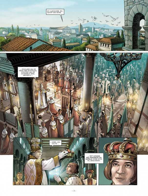 In 1495 redt paus Borgia zijn eigen hachje door de kroon op het hoofd van de afstammeling van Sint-Lodewijk te plaatsen. Met deze plechtige daad maakt hij van de Valois de wettige opvolger van Alfons II. Wettelijk gezien ligt de weg naar Napels wijd open. Wanneer de deelnemers van de viering de kerk verlaten, krijgen Lucretia en haar echtgenoot ruzie in het openbaar. Henri en Blasco, belast met de veiligheid van de stoet, worden daarbij betrokken.