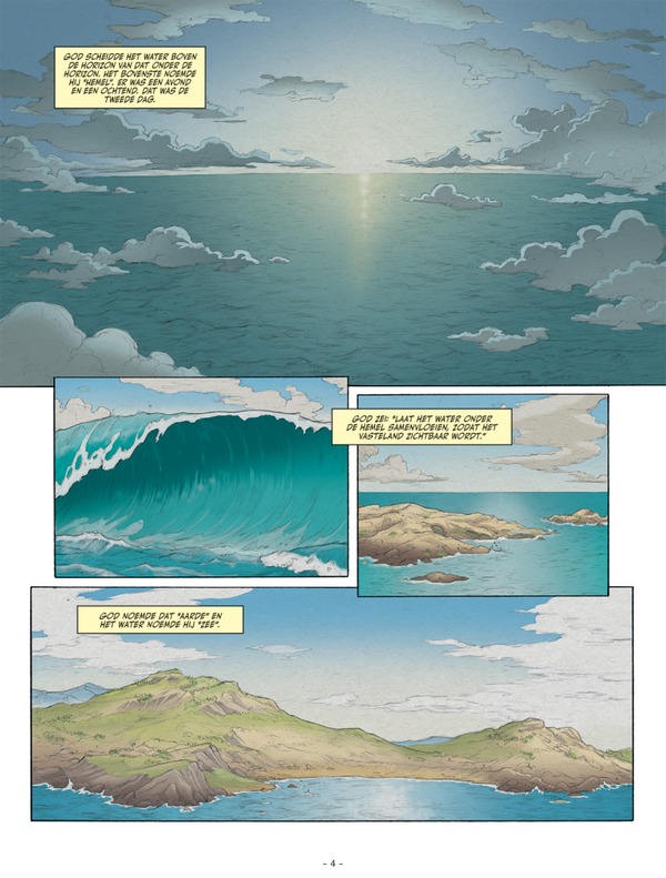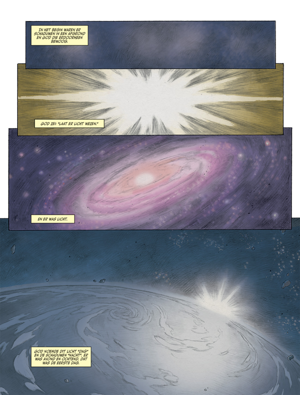 Eerst is er duisternis, daarna schept God in zes dagen het universum. Hij creëert een ongeziene schoonheid en elk detail is perfect: hemel, zee, aarde, planten, dieren en Adam, de eerste mens, geschapen naar Zijn evenbeeld. Hij geeft Adam een metgezel: Eva. Samen delen ze alle geneugten van de hof van Eden. Eva bezwijkt echter voor de leugens van de slang – een personificatie van het Kwade – die de mens wil scheiden van Gods verlossing. Verjaagd uit het paradijs, bevolken Adam en Eva de aarde, terwijl ze de last van de eeuwige zonde dragen …