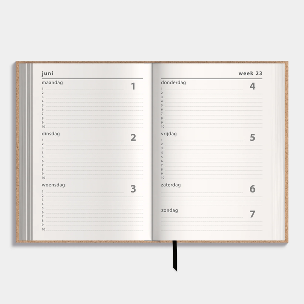 Mooie schoolagenda 2026-2027 met een harde cover met kurken afwerking voor een natuurlijke uitstraling. De jaartallen '2026-2027' zijn in zwart op de omslag gedrukt.
